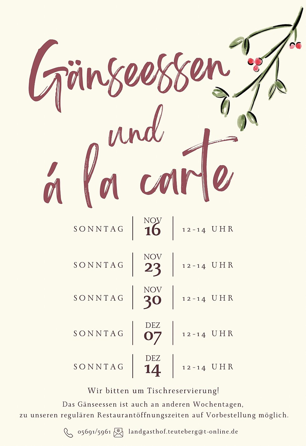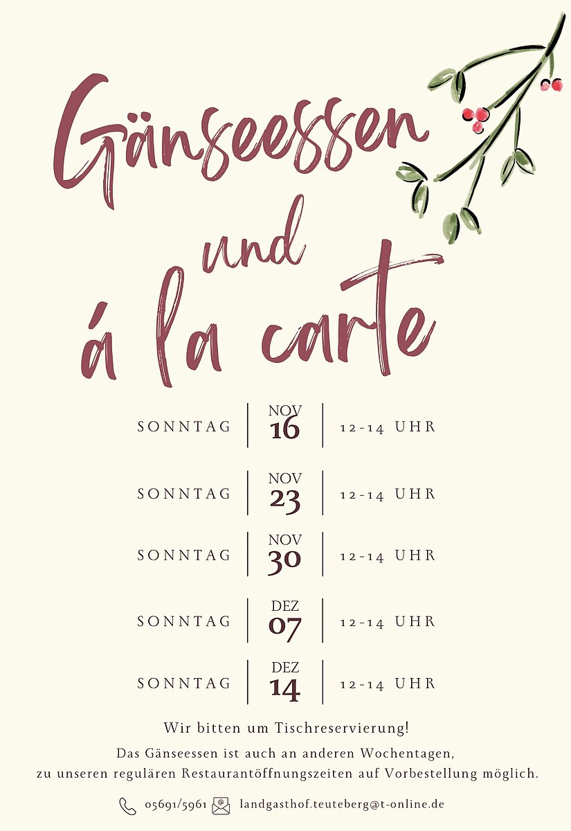 Die zusätzlichen Öffnungstage haben wir rechts im Bild aufgeführt. Und wer lieber zu den gewohnten Restaurantzeiten vorbeikommt: Auch dann ist das Gänseessen nach Vorbestellung gerne möglich.
